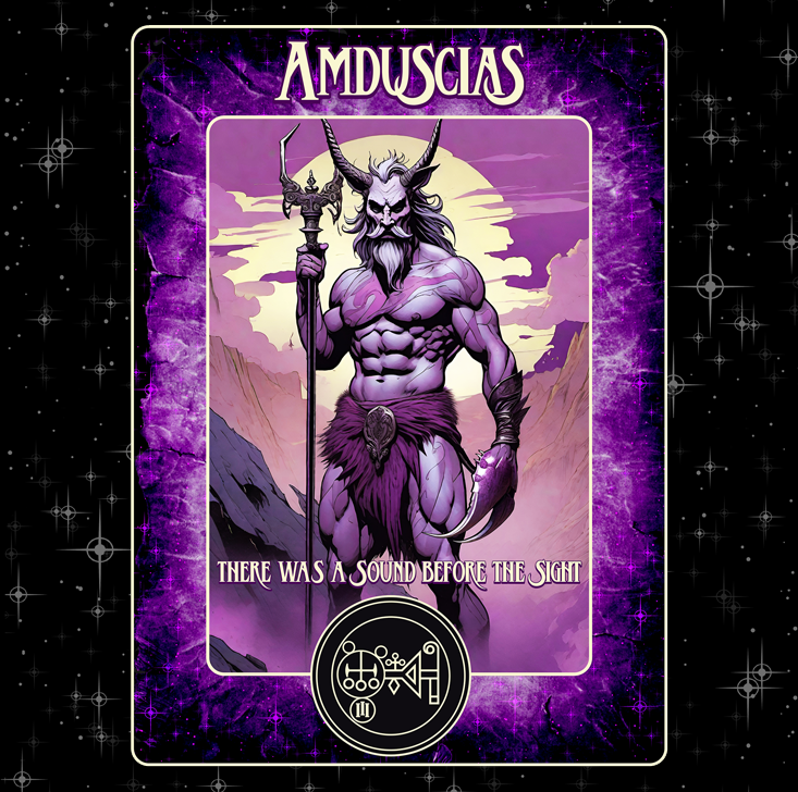 Amduscias un grande e forte duca, egli commosse il foorth come un unicorne, quando si alza davanti alla sua maister in forma umana, essendo comandato, egli si mette a passo, che le trombe e tutti gli strumenti musicali possano essere uditi e non visti, e anche che gli alberi si piegheranno e pentoleranno, secondo le convocazioni, egli è eccellente tra i familiari, e ha nove t.